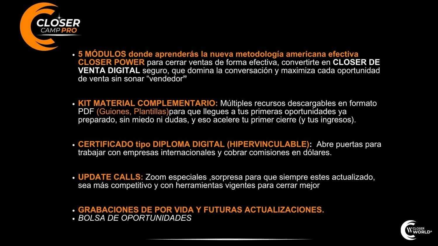 Closer de Ventas es el único programa diseñado para convertirte en un experto en cierres de ventas digitales en tan solo 30 días. Sin importar tu experiencia previa, te brindamos las herramientas y el conocimiento para alcanzar ingresos significativos de manera remota.